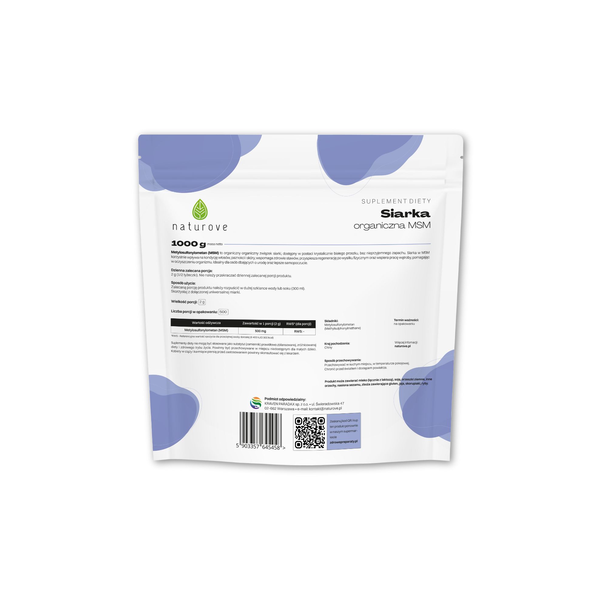 Produkt marki naturove to wysokiej jakości siarka organiczna w formie proszku, pozyskiwana z certyfikowanego źródła. Dodatkową korzyścią z suplementacji MSM jest poprawa przyswajania witamin A, C, D, E oraz minerałów takich jak magnez czy selen.